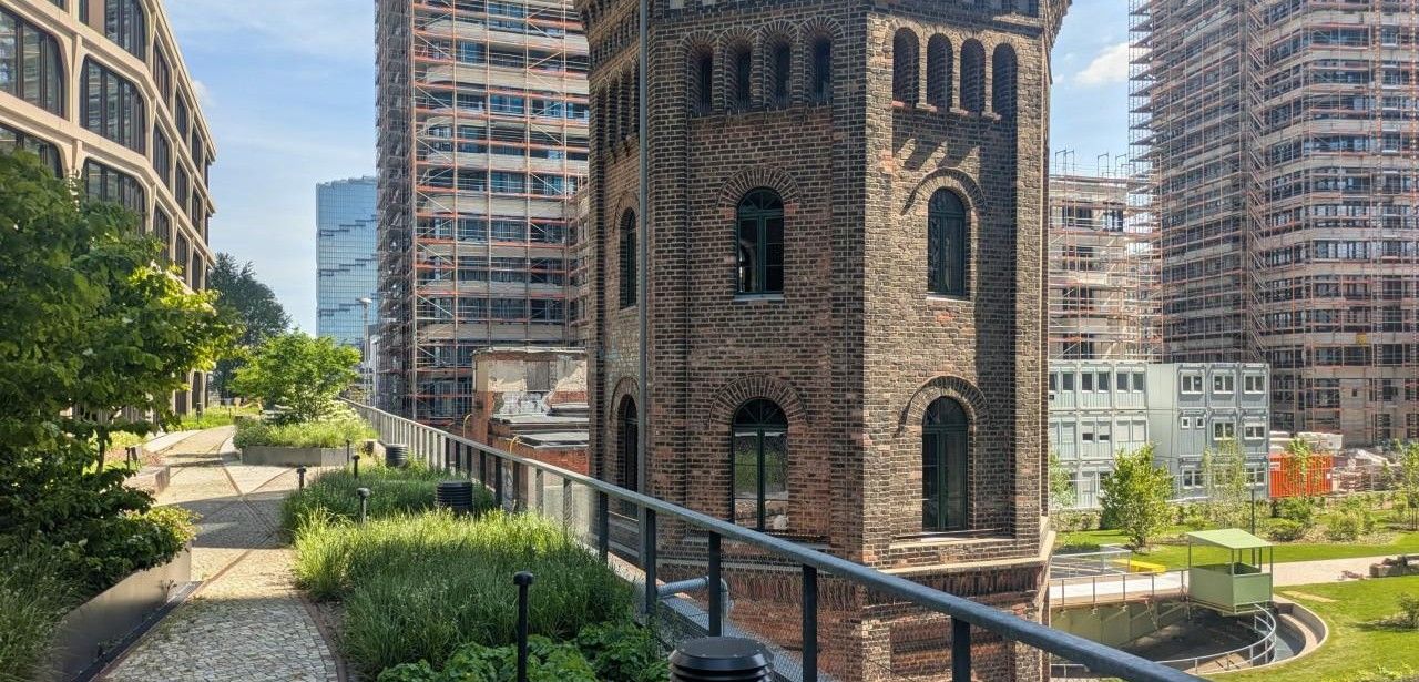 Auf einer Gesamtfläche von 3.000 Quadratmetern nehmen Retentionsdächer rund 2.700 Quadratmeter ein und reduzieren spürbar das städtische Abflussvolumen. Neben der aktiven Regenwasserrückhaltung bieten sie extensive Vegetationszonen, die als Aufenthaltsbereiche mit Sitzplätzen ausgebildet sind und das Mikroklima positiv beeinflussen. Die historisch integrierte Mieterterrasse besticht durch naturnahe Bepflanzung, bequeme Möblierung sowie Blickbezüge und schafft eine harmonische Brücke zwischen industrieller Vergangenheit und nachhaltiger Zukunftsperspektive. Zusätzlich dient die Begrünung als Lebensraum für Insekten und fördert die Biodiversität in der Innenstadt.